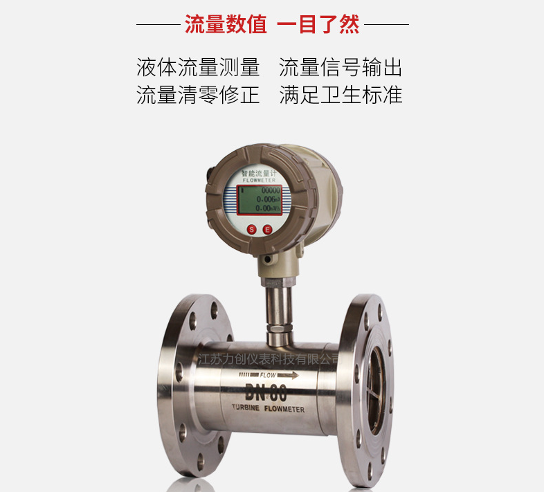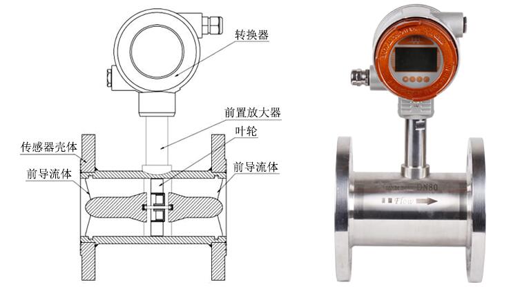 流体流经传感器壳体,由于叶轮的叶片与流向有一定的角度,流体的冲力使叶片具有转动力矩,克服摩擦力矩和流体阻力之后叶片旋转,在力矩平衡后转速稳定,在一定的条件下,转速与流速成正比,由于叶片有导磁性,它处于信号检测器(由**磁钢和线圈组成)的磁场中,旋转的叶片切割磁力线,周期性的改变着线圈的磁通量,从而使线圈两端感应出电脉冲信号,此信号经过放大器的放大整形,形成有一定幅度的连续的矩形脉冲波,可远传至显示仪表,显示出流体的瞬时流量或总量。在一定的流量范围内,脉冲频率f与流经传感器的流体的瞬时流量Q成正比,流量方程为: