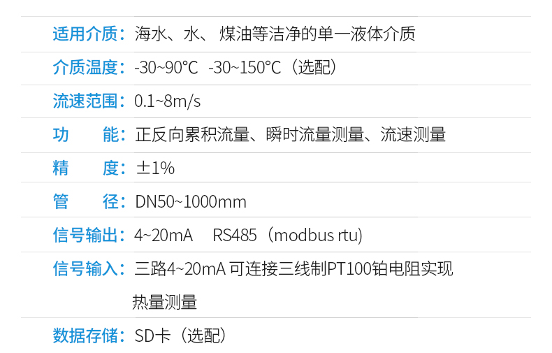 适用口径: DN6-DN6500适用温度: -30 to 400℃ (适用防爆区).测厚探头(可选)测量范围: (1.0 - 200) mm分辨率: 0.01 mm线性度: 0.1 mm标准型: -20℃ to +60℃高温型: 0℃ to +200℃短时间可达+540℃应用领域